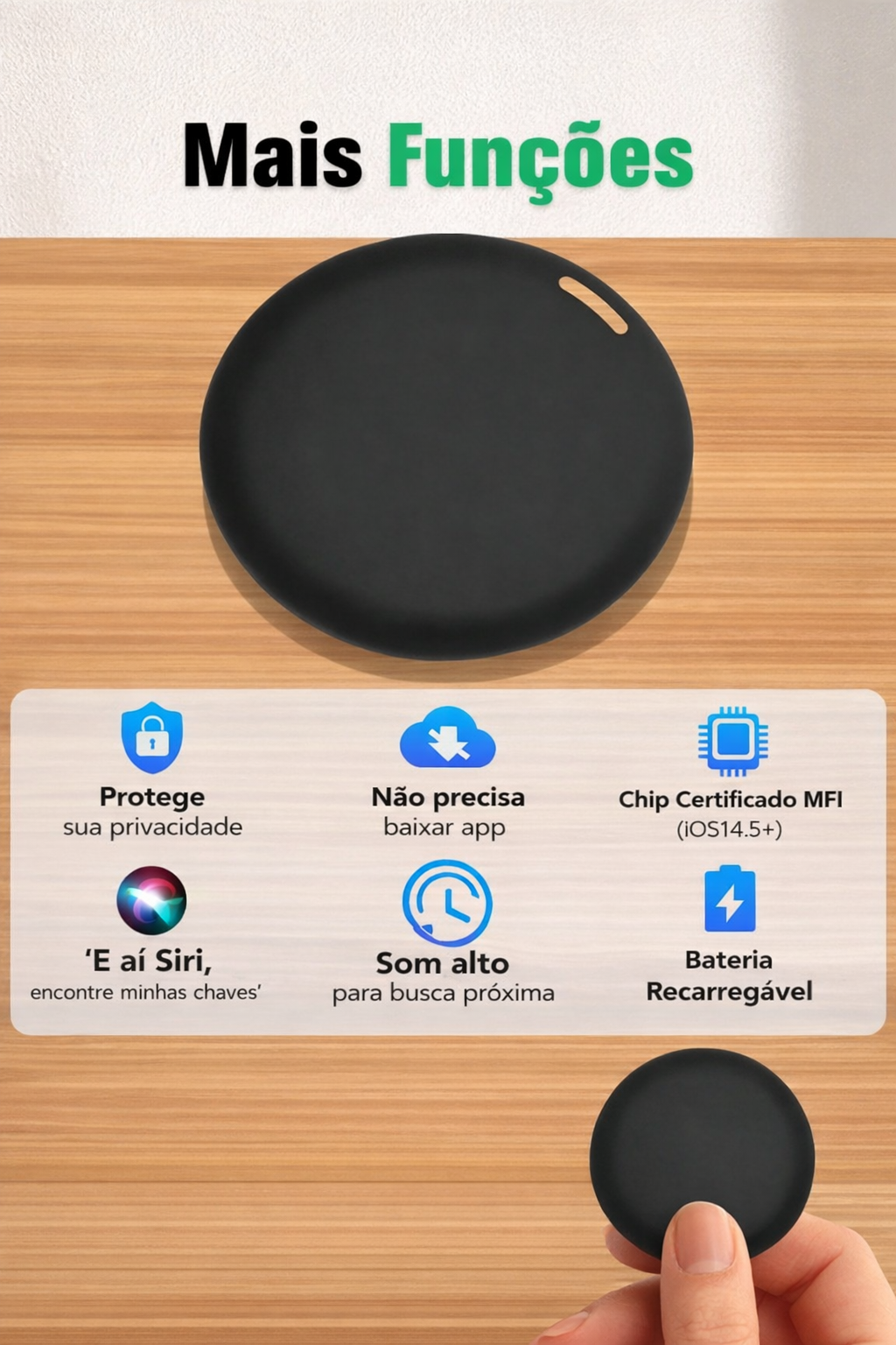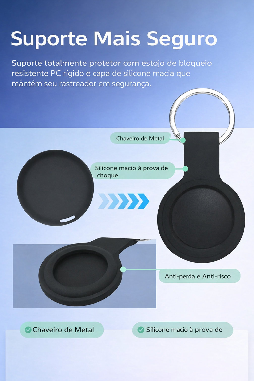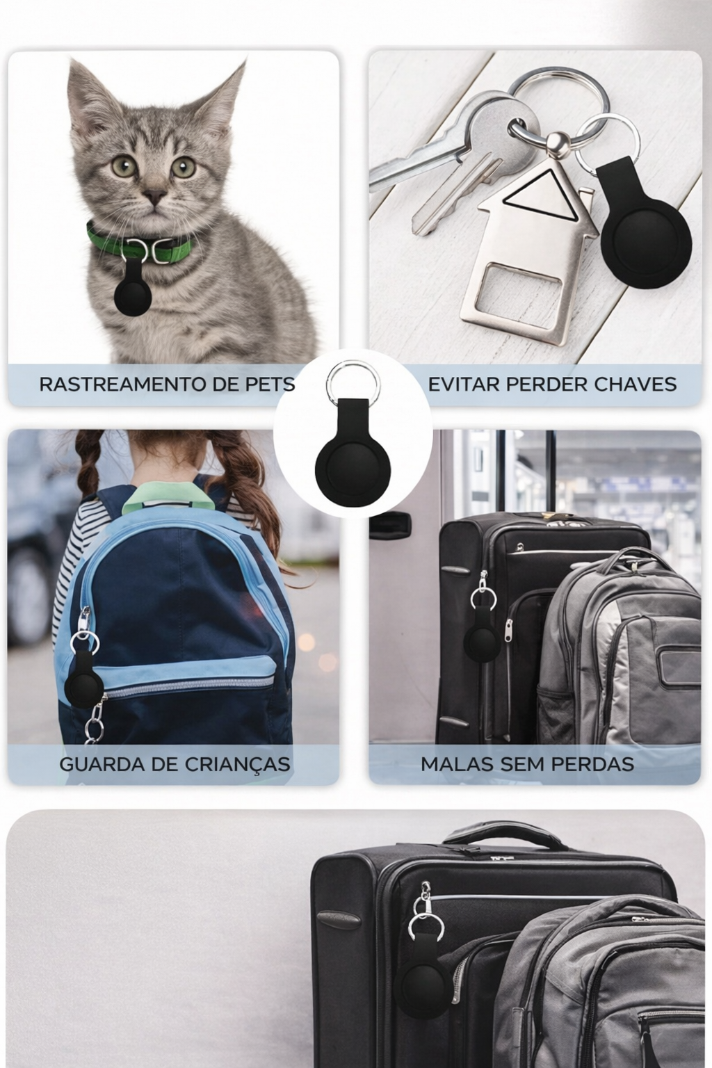 Disponível nas cores preto e branco, o rastreador possui um design discreto que combina facilmente com qualquer acessório. A bateria substituível garante maior durabilidade, enquanto o pacote inclui opções com 1, 2 ou 4 unidades para atender às suas necessidades.
